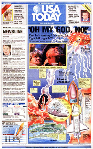 O lançamento do USA Today, em 1982, marcou uma revolução estética no jornalismo. Distribuído nacionalmente nos Estados Unidos, o jornal adotou um design moderno e consolidou o uso da infografia como linguagem jornalística. Um exemplo marcante foi a cobertura do desastre da nave Challenger, em 1986, quando o jornal publicou um infográfico detalhado no dia seguinte ao acidente — referência mundial na época.