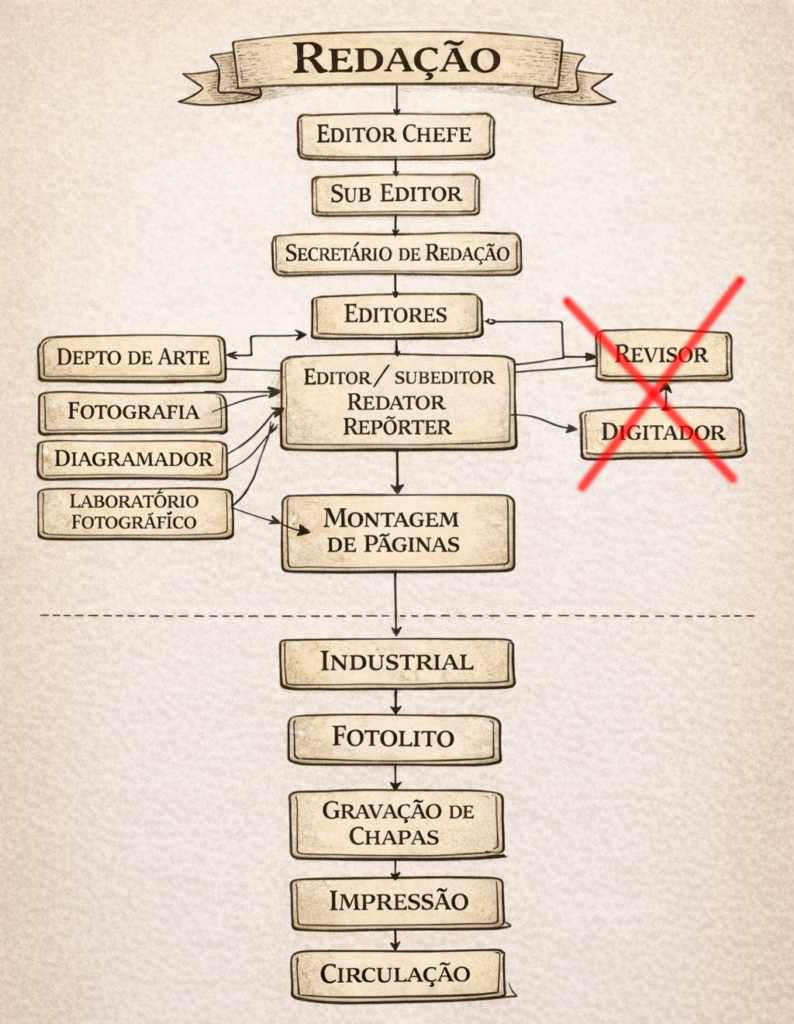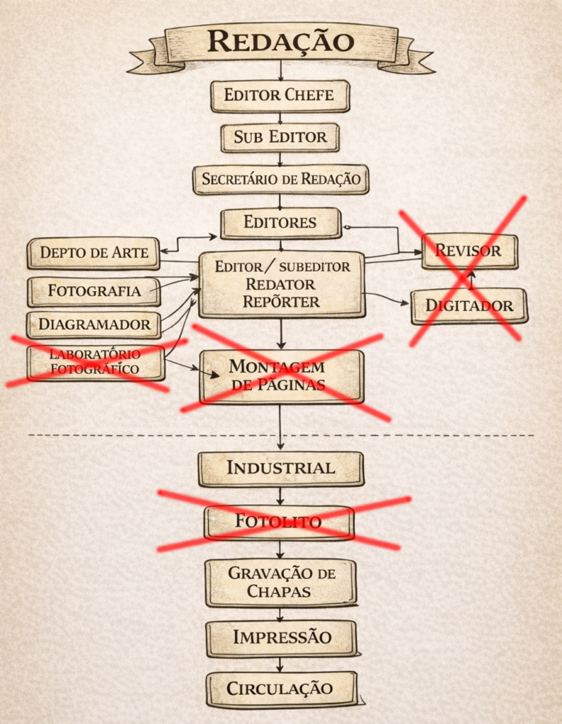 A estrutura de um jornal convencional dependia de uma cadeia de profissionais especializados: digitadores, revisores, montadores de página, operadores de fotolito e técnicos de laboratório fotográfico. Com a digitalização, muitas dessas funções começaram a desaparecer.