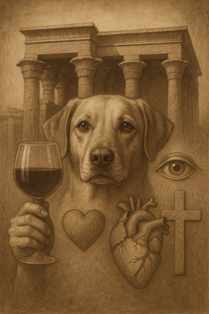 – A composição mistura elementos visuais de naturezas distintas, o cão em estilo realista, mãos, taça de vinho e coração humano — combinados a chamas e símbolos religiosos estilizados. Essa justaposição de estilos e texturas é típica de criações em IA, especialmente em ferramentas como o MidJourney, que frequentemente produzem imagens híbridas com aparência de colagem. Além disso, a integração dos elementos revela transições com aspecto de pinceladas digitais, lembrando o efeito de brush painting característico desses modelos de geração de imagem. Ao que acrescento: realmente, se não educar a sua IA sobre princípios básico de plástica e composição ela não terá uma base da questão fundamental da Unidade e Variedade. Unidade de manter o mesmo tratamento plástico entre os elementos de seu trabalho.