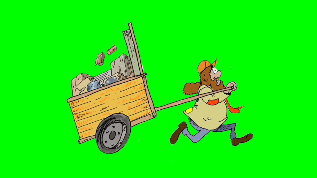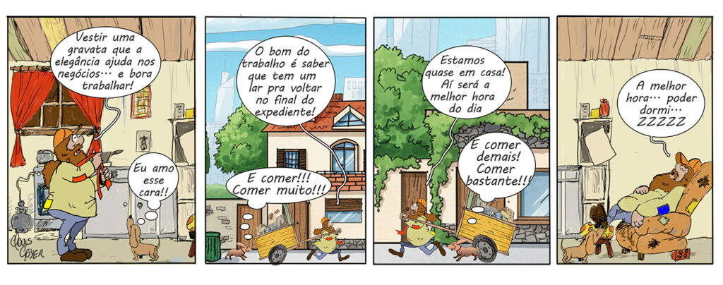 Zé da Gravata carregando o carrinho dele em uma rua, seguido pelo Bilu, cruzam por um senhor, que não estava na tira, foi acrescentado na animação para deixar mais rica.