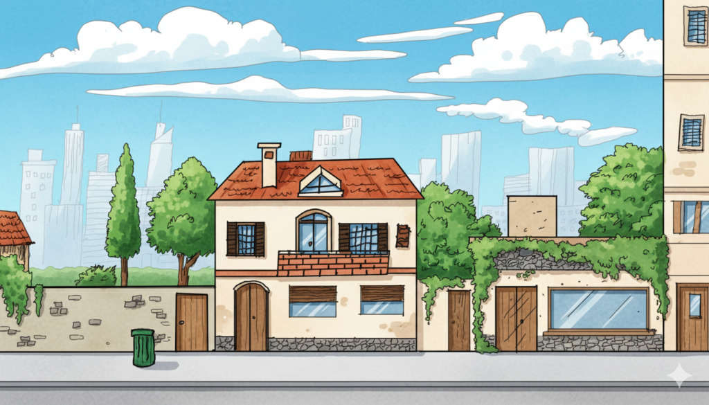 No storyboard já temos a noção dos quadros chaves, então podemos criar os cenários que são apenas dois. A salinha da casa e um plano geral da rua, como é uma animação muito curta, na faixa dos 40 segundos, o animatic se mistura com o produto final.