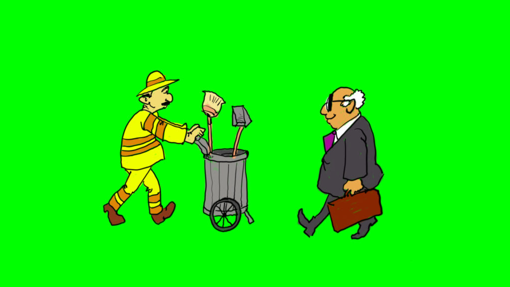 Zé da Gravata e Bilu voltando pra casa (a mesma rua só com o movimento de retorno), acrescentado um trabalhador da limpeza pública.