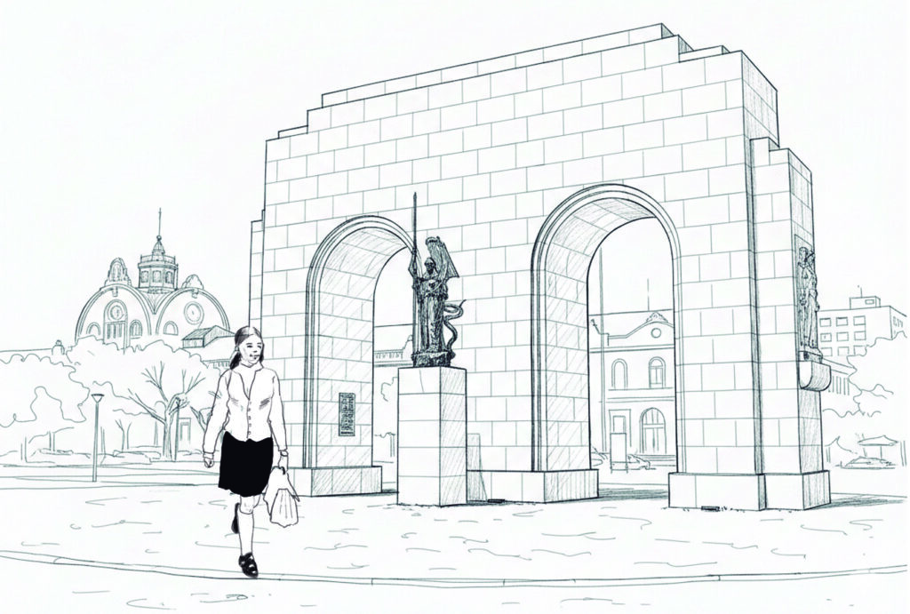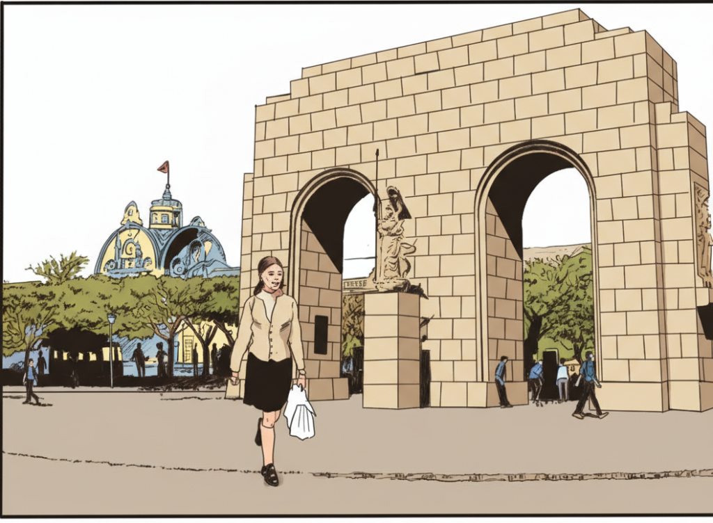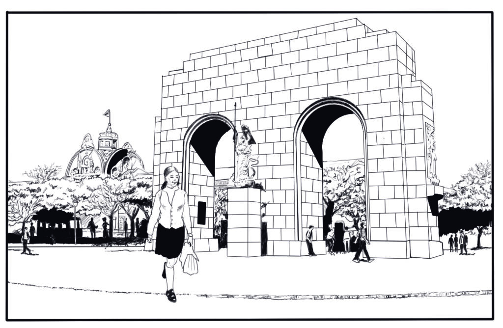Com usando uma foto como referência fiz o cenário que eu queria, a foto era atual, mostrando uma feira de artesanato que existe hoje e não existia na época, eu queria que aparecesse o Arco do Triunfo com um ângulo bem específico, as fotos da época não conseguia que queria, então peguei uma atual e fui adaptando. Levei mais de quatro horas para um quadrinho, mas ficou bem legal, um nível de arquitetura bem satisfatório onde insere uma menina estudante da época para compor o desenho. Digamos que finalizei tudo em cinco horas.